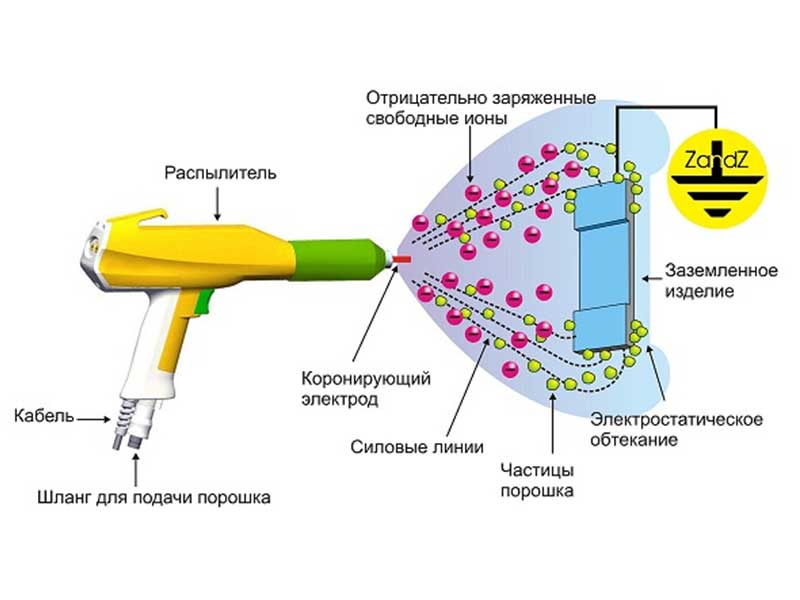 Нанесение на окрашиваемую поверхность порошкового покрытия происходит в камере напыления с помощью пистолета-распылителя, в котором частицам полимерного порошка придаётся электрический заряд и который с помощью сжатого воздуха транспортирует порошок к детали. Под воздействием электростатических сил частицы порошка притягиваются к поверхности окрашиваемой детали и равномерными слоями располагаются на ней. Не осевшие на изделие частицы порошковой краски улавливаются в окрасочной камере и могут быть использованы для повторного напыления, что невозможно при использовании обычных жидких красок. Далее изделие с нанесенной порошковой краской переносится в камеру полимеризации для отверждения краски.
